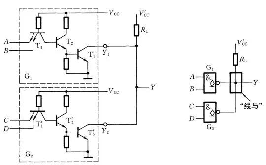 通过OC门这一装置,能够让逻辑门输出端的直接并联使用。两个OC门的并联,可以实现逻辑与的关系,这种设计方便主备机分别控制某个电路,称为“线与”,但在输出端口应加一个上拉电阻与电源相连。这种配置的特性是,输出侧上拉电阻(pull-up resistor)连接的电压不一定需要使用与输入侧IC同样的电源(VCC),可以是用更低或更高的电压来代替。因此,集电极开路电路有时用于连接不同工作电位、或用于外部电路需要更高电压的场合。