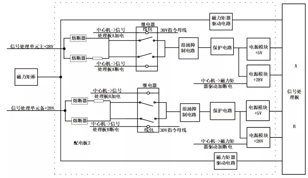 电源板2设计实现信号处理板的配电和仲裁控制及磁力矩器驱动接口。信号处理板的加断电由中心机通过4条间接指令控制,其中磁力矩器的供电可由中心机通过4条间接指令进行单独控制。信号处理板需+5V、±12V,+28V,+3.3V,+1.5V。二次电源+3.3V,+1.8V,+1.5V较低,传输后会造成电压下降使设备无法工作,不宜过板传输,因此设计在本板上利用电压模块实现。因此电源板2需实现主备+5V、±12V,+28V共八路电源。为保护一次母线,在一次母线输入端串接熔断器保护。同时在继电器动触点端串接浪涌抑制电路以防止启动电流对母线和继电器的冲击。