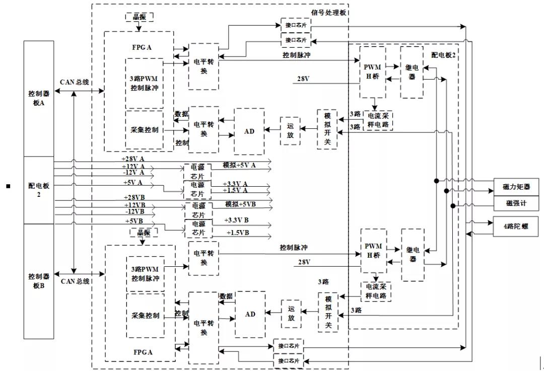 在这个实例中,信号处理板主要实现1个三轴磁强计模拟量采集,3路磁力矩器控制和4路扩展串口,同中心计算机可实现交叉CAN总线通信控制。