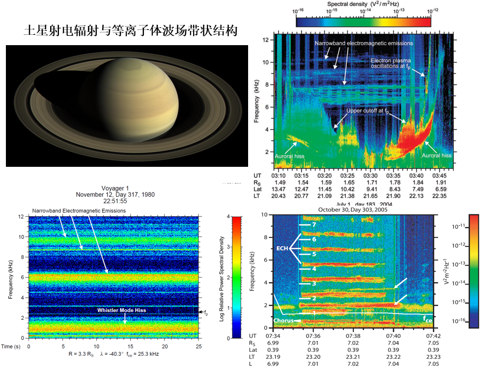 下图展示了旅行者1号于1980年及Cassini飞船于2004-2005年间记录到的土星射电辐射(Kurth and Zarka 2001; Gurnett et al. 2005 Science)。根据左下和右上两图,可以观察到多条几乎平行的窄带辐射结构,虽不似上面展示的太阳和木星射电辐射中的那种曲延形态,但多带并行这一基本特征是显而易见的。