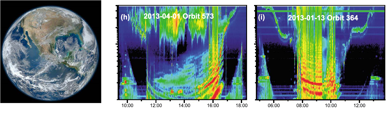 以上观测说明等离子体波场的多带特征是普遍存在的。确实,在木卫三(Ganymede)附近也探测到了。木卫三是太阳系百余颗卫星中最大的一颗,也是迄今发现的唯一具全球内禀磁场与磁层的卫星。下图展示了伽利略飞船于1996年拍到的木卫三本尊及相应的等离子体波场频谱数据,其中的带状结构清晰可见(Kurth et al. 1997 GRL)。