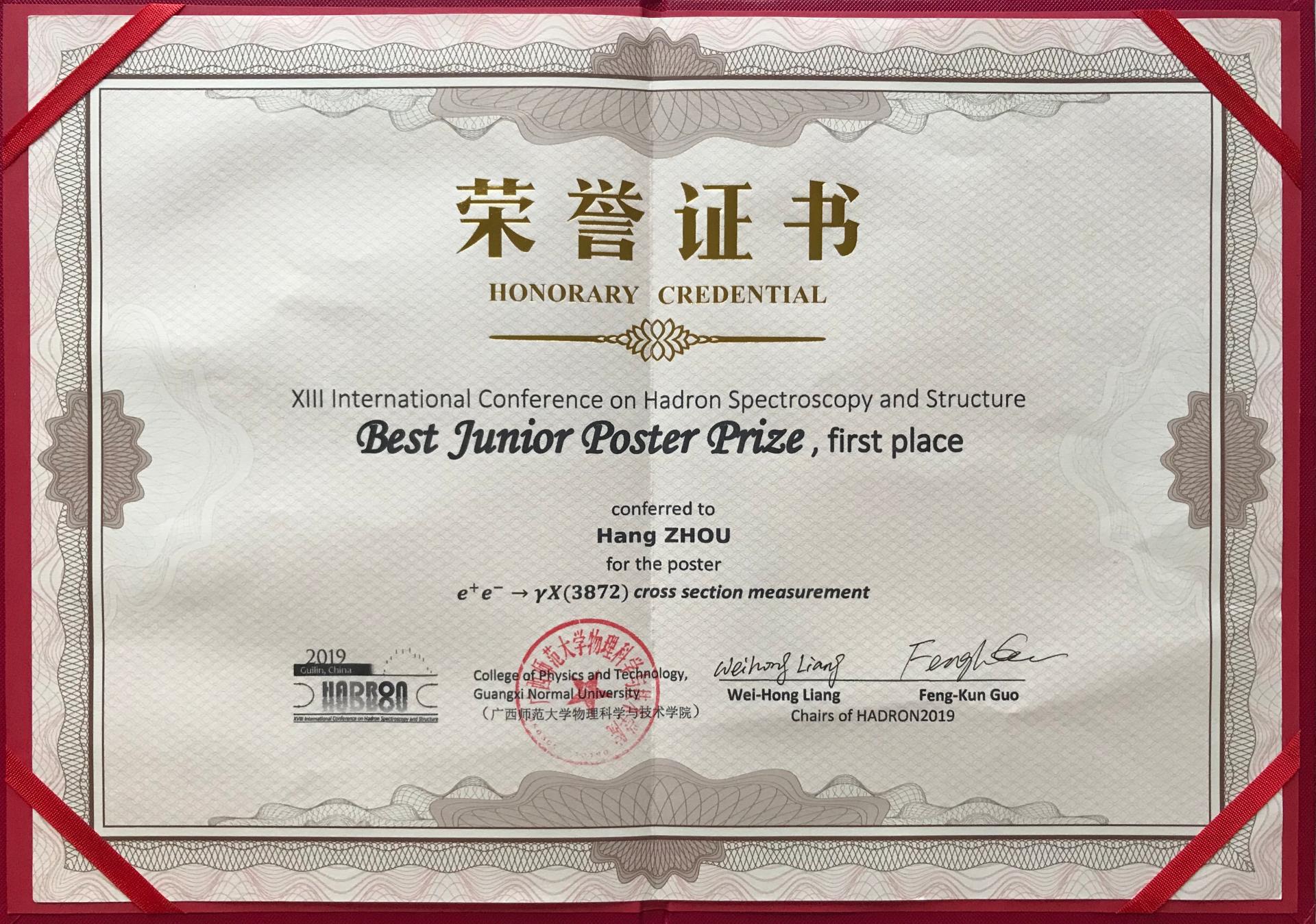 8月21日,在桂林召开的第18届强子谱与结构(Hadron2019)国际会议上,我院刘智青教授指导的博士研究生周航喜获海报评选活动一等奖。会议主席在闭幕式上为获奖者颁发了荣誉证书和奖金。