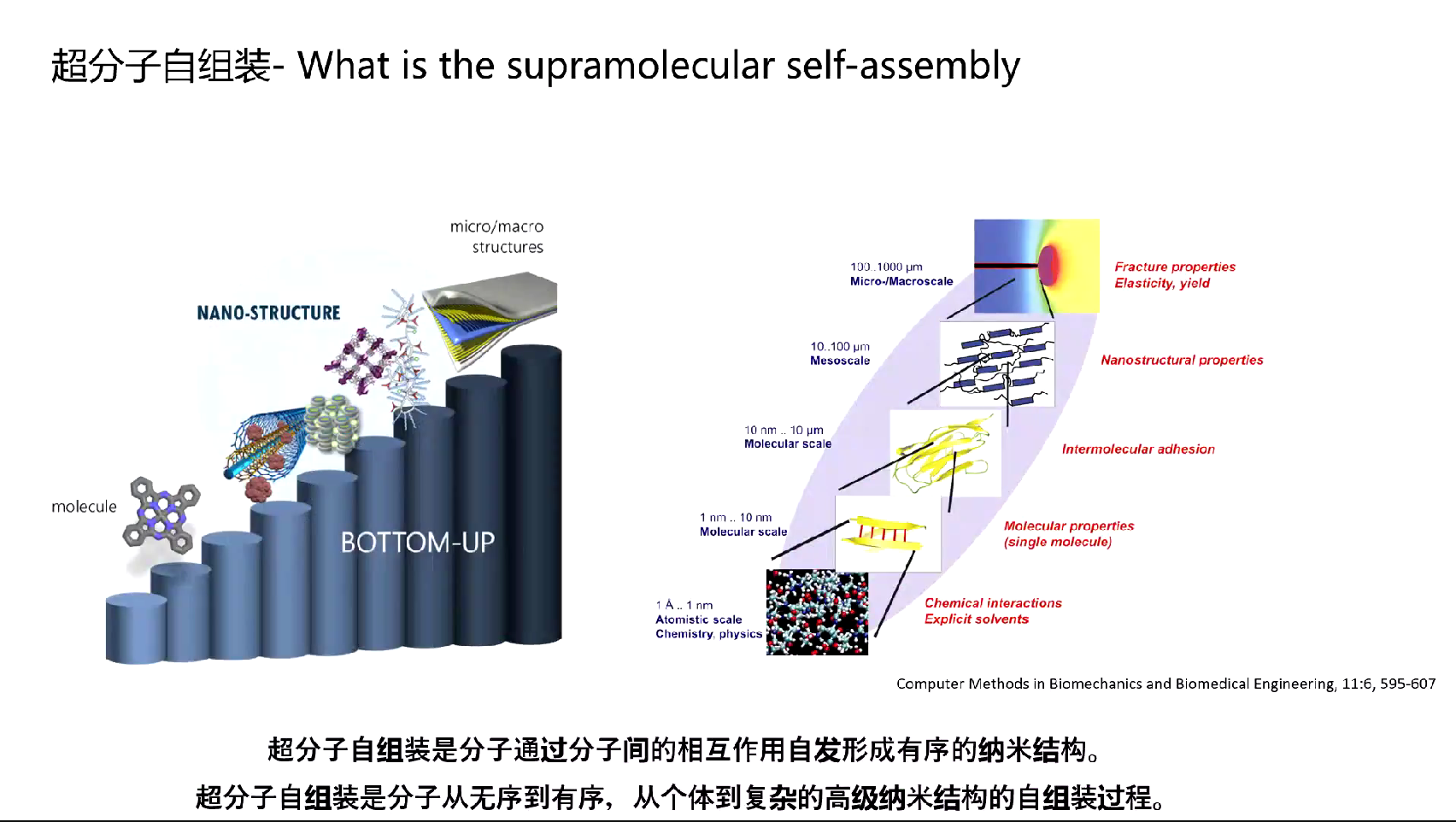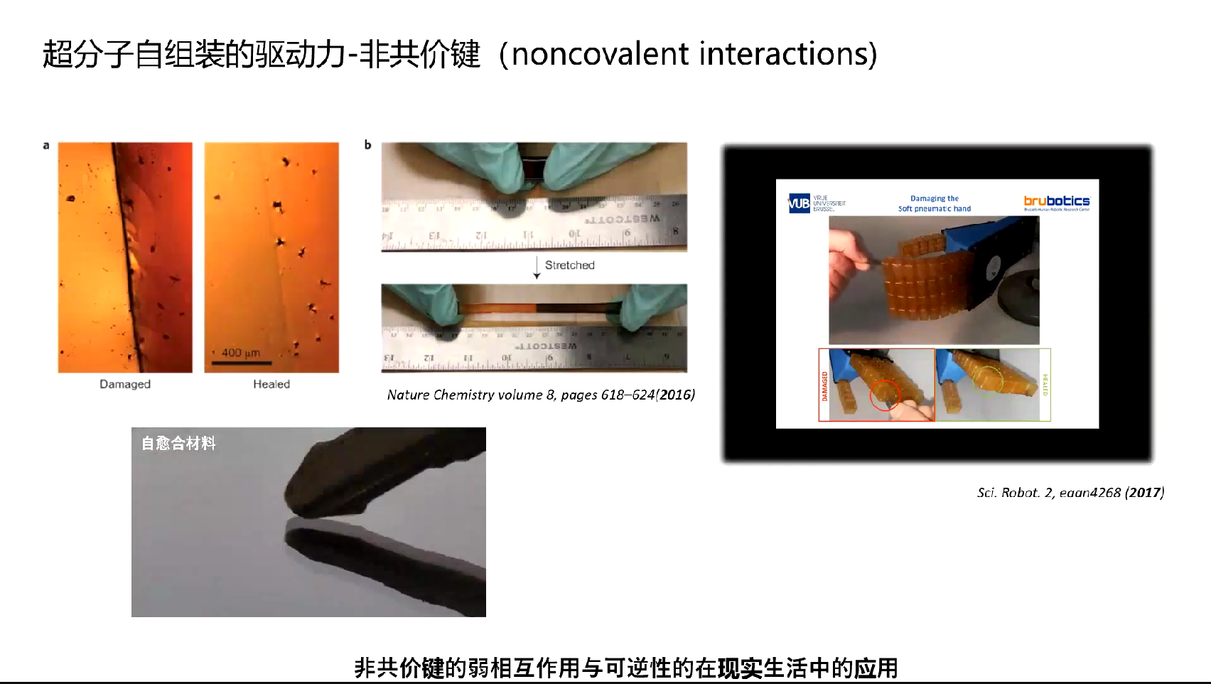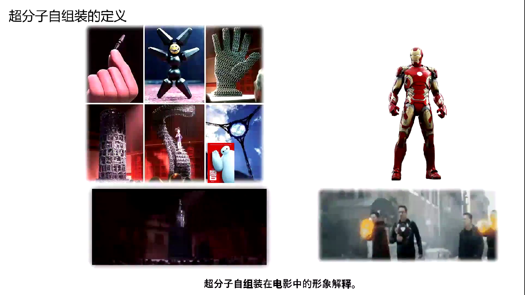 首先,刘老师由Science创刊125周年提出的125个问题之一“How Far Can We Push Chemical Self-Assembly?”开头,用通俗易懂的语言为同学们简单地介绍了什么是超分子自组装,即分子通过分子间的相互作用自发形成有序的纳米结构的过程,并借助示意图演示了超分子自组装的过程。刘老师以电影中钢铁侠的纳米战甲为模型,直观展示了未来超分子自组装的应用以及这种自组装结构特点——可逆性,即拥有自我修复、自我愈合的能力,目前,科学家已经研制出了许多这种自愈合材料并投入应用。