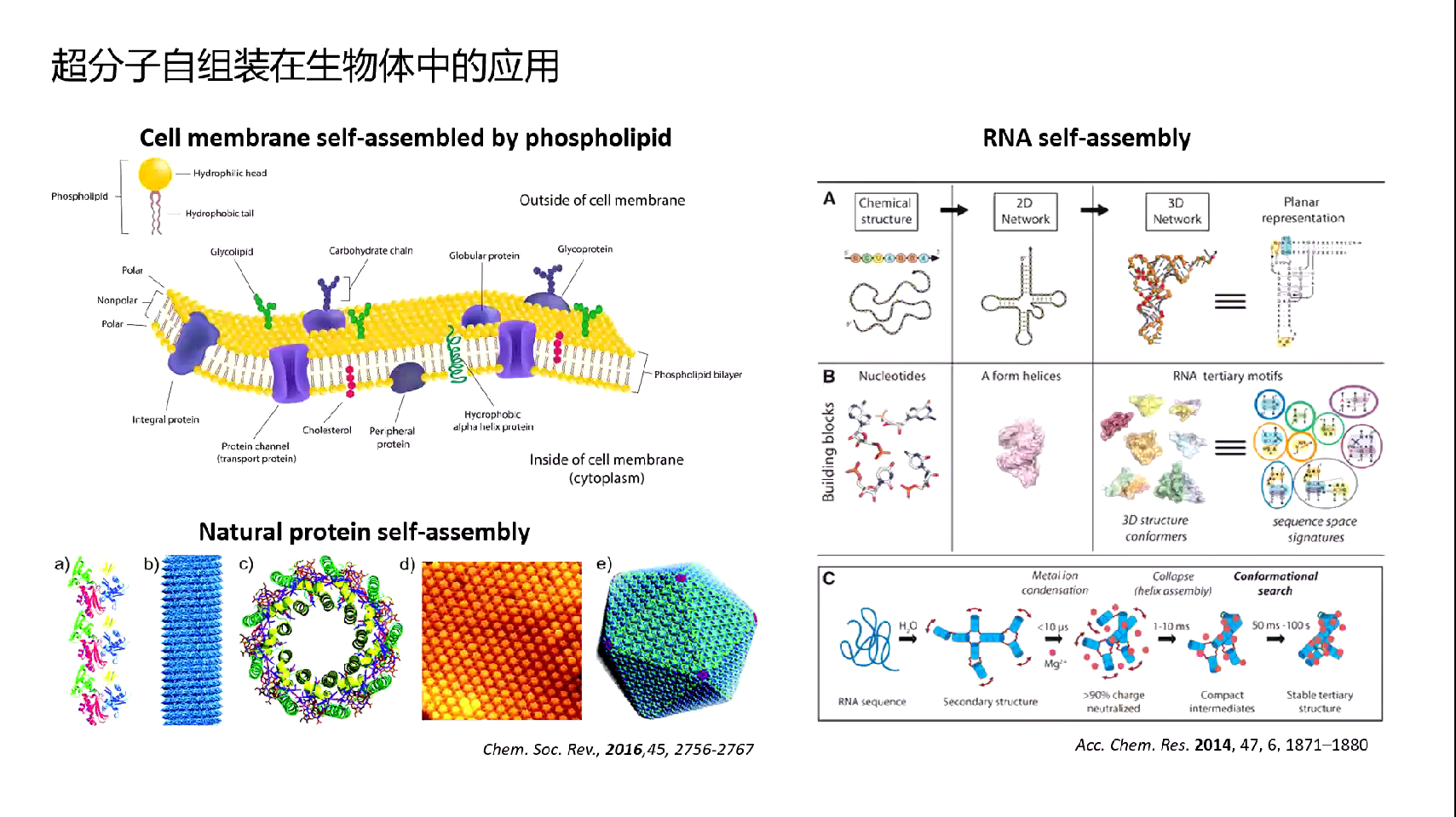 随后,刘老师又讲述了超分子自组装在生命活动中的应用,这不禁让我们感叹于人体中各种精妙存在的自组装结构。刘老师介绍了几种目前研究比较广泛的由不同作用力驱动的超分子自组装类型,分别是由疏水作用、氢键作用和金属配位键作用驱动的超分子自组装,由此,科学家合成了各式各样的具有不同结构的纳米材料,但目前仍然受到限制的一个方面是,如何进行更高级的组装,形成更高级的结构单元,这都是科学界尚在探究的问题。