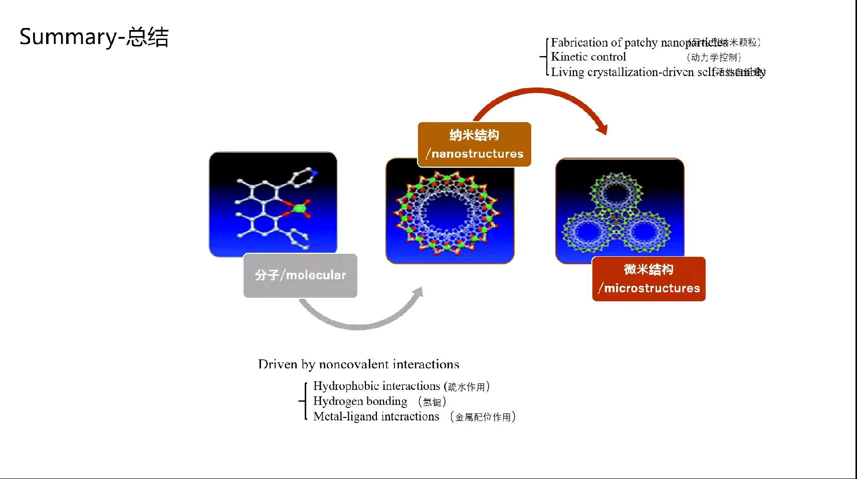 最后,刘老师讲到,与生命体中的超分子自组装过程相比,科学家目前的对于超分子自组装的研究还处于初级阶段,尤其是对纳米颗粒的研究是极具匮乏的,当前自组装领域面临着诸多挑战,例如生物体中复杂的自组装过程以及如何对自组装过程进行追踪等都是亟待解决的问题,这就需要不断的有青年学者投身超分子自组装研究。