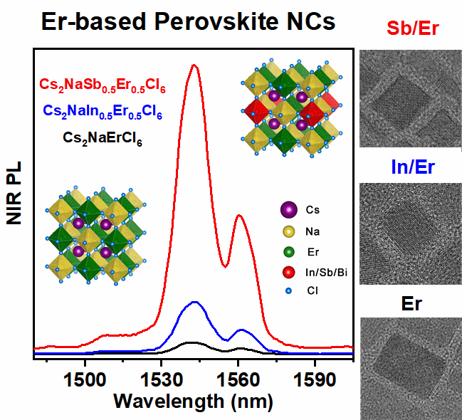 非铅钙钛矿纳米晶的无(低)毒性、高稳定性且优良的光电特性,使其在发光二极管、光电探测器、太阳能电池等领域引起了广泛关注。目前,研究人员大多聚焦于具有可见光发射的非铅钙钛矿纳米晶性能的研究,对于发光效率很低的近红外区域的发光体系研究较少(尤其在通讯波长~1.5 μm)。因此,开发出具有高效近红外荧光的非铅钙钛矿纳米晶并探究其发光动力学机理具有重要意义。迄今为止,稀土基双钙钛矿纳米晶并未被报道。