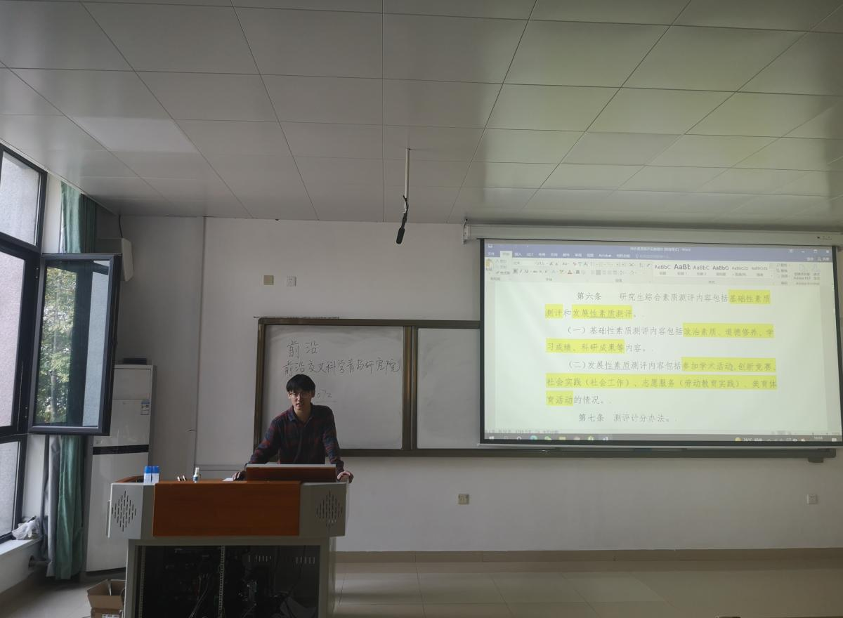 为帮助新生更快地适应研究生生活,9月11日,研究院邀请了学长学姐分享经验心得。朱国庆强调了健康的心理和强健的体魄的重要性,鼓励新生在科研之余多进行体育锻炼。孟璇为新生介绍了创新创业大赛的具体情况,并推荐了一些学生组织和网站。袁睿则以“成为一个什么样的人”的问题切入,引导新生为自己的未来作好规划。