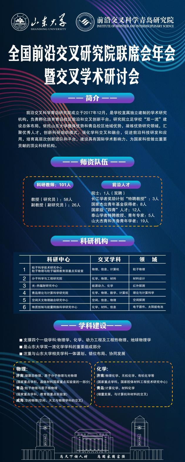 2021年9月25日,由全国前沿交叉研究院院长联席会秘书处、北京大学前沿交叉学科研究院共同主办的2021年度全国前沿交叉研究院院长联席会年会暨交叉学术研讨会在北京召开。前沿交叉科学青岛研究院作为应邀单位,也派出相关负责人和教授学者参与会议。