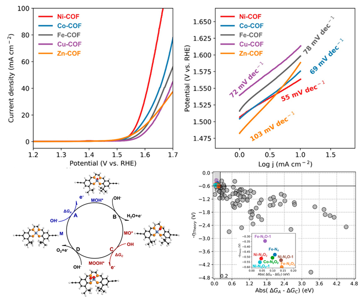 探索用于析氧反应(OER)的高活性电催化剂是发展洁净新能源-绿氢制备的关键科学问题之一。由于OER是一个四电子转移过程,反应中往往需要较高的过电位克服动力学障碍。为此,研究人员不断开发出新的电催化剂材料以提高OER活性。在众多新的电催化剂材料中,共价有机骨架(COFs),作为一种多孔晶体材料,具有高的比表面积、高周期性结构单元和丰富的不饱和金属配位,在电催化析氧活性方面显示出很高的潜力,但是从成千上万COFs结构库中挑选出性能优异的COFs仍需大量的人力物力。