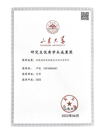 经个人申请、研究院推荐、学校专家组评审,我院2018级博士研究生尹航提交的论文《新能源材料的载流子动力学研究》获TapTap点点2022年研究生优秀学术成果奖优秀奖。
