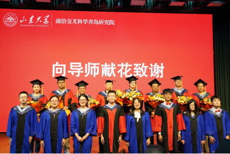 在学位授予仪式上,邓伟侨副院长为每位毕业生颁发学位证书并合影留念。典礼还表彰了2022届优秀毕业生,赵罡书记为优秀毕业生颁发获奖证书。此外,张学尧教授为校友班级理事代表颁发聘书。毕业生代表向导师敬献鲜花,感谢各位老师的付出与栽培。接下来毕业生代表为前沿院全体师生演唱歌曲《青春纪念册》,“风浪再大,我也会勇往直前;我们的爱,镶在青春的纪念册”,将现场气氛推向高潮,每一位毕业生心中充盈着满满的成就感和温暖,一起动情合唱。在山大的收获与成长,化作此刻最灿烂的笑容。最后,师生合影留念,感恩几年时光的互相陪伴,都会是每一个人心中最珍贵的回忆。