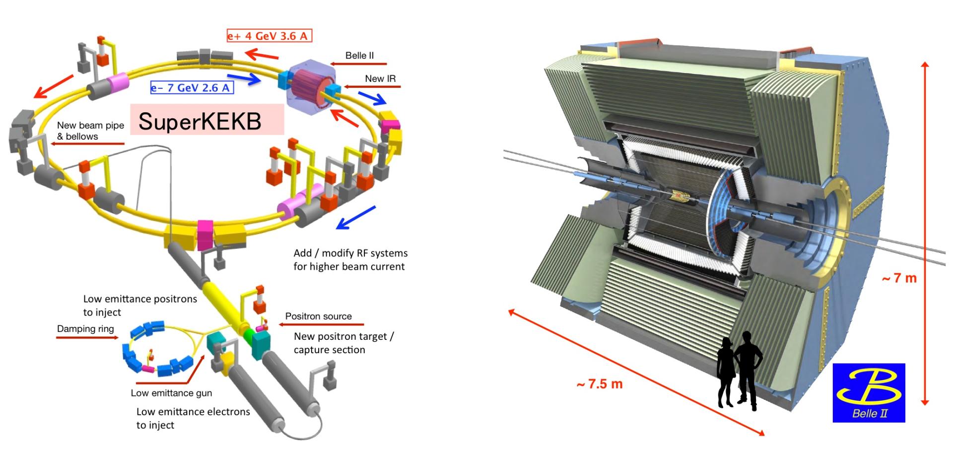 Belle II国际合作组实验位于日本筑波市的高能加速器研究机构,其前身是第一代B介子工厂Belle实验。2010年,随着Belle实验运行结束,KEK联合多家合作单位决定将B介子工厂全面升级为超级B介子工厂。其中,加速器SuperKEKB首次采用了纳米级的束流技术,其设计对撞亮度为8x1035 cm–2s–1,比之前提高了近40倍,达到世界最高对撞亮度。为匹配高亮度对撞要求,探测器同样进行了全面的升级。新的Belle II探测器最内层安装了高精度的像素探测器和硅顶点探测器,为B介子等衰变顶点测量提供了更好的分辨率。
