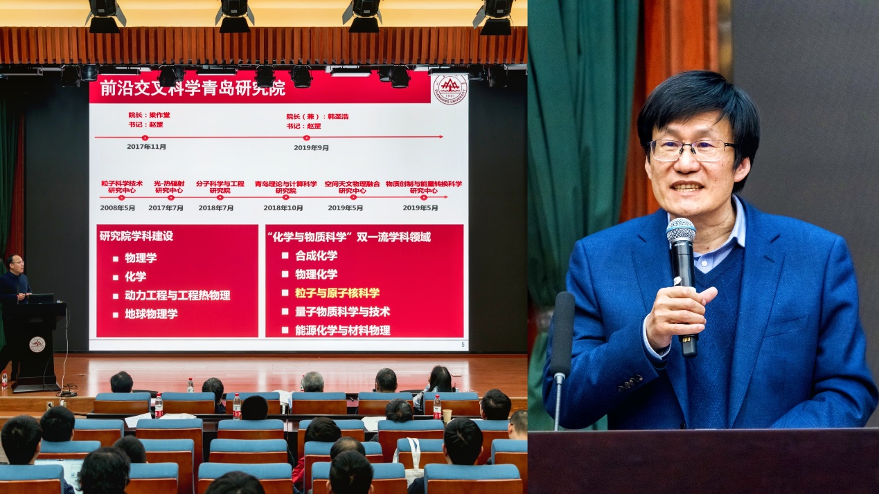 在学科方向与青年教师情况介绍阶段,空间科学研究院执行院长陈耀介绍了“天文与空间科学”方向发展现状、前沿交叉科学青岛研究院副院长黄性涛介绍了“粒子与核科学”方向发展现状、物理学院王健教授介绍了强相互作用物理理论研究团队概况;青年教师周剑、刘智青、张宏、李冰、李凯、孔祥良分别作为相应研究方向的代表介绍了各自研究方向和研究工作进展等基本情况。专家及领导全程参与讨论并点评,对青年教师未来的科学研究方向及重点等给予指导性建议。