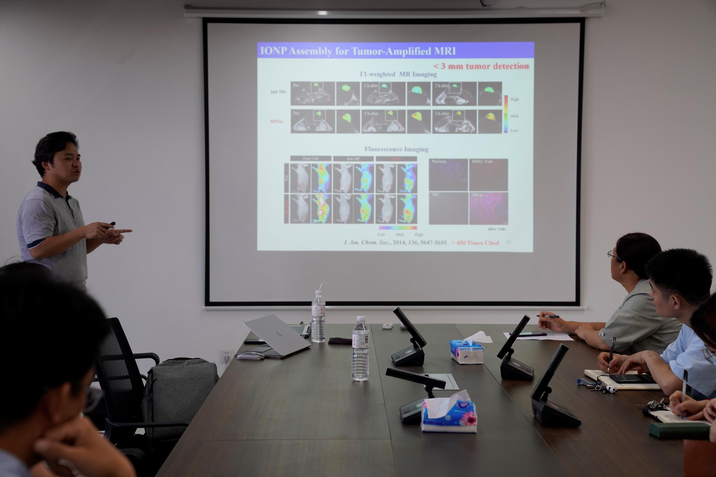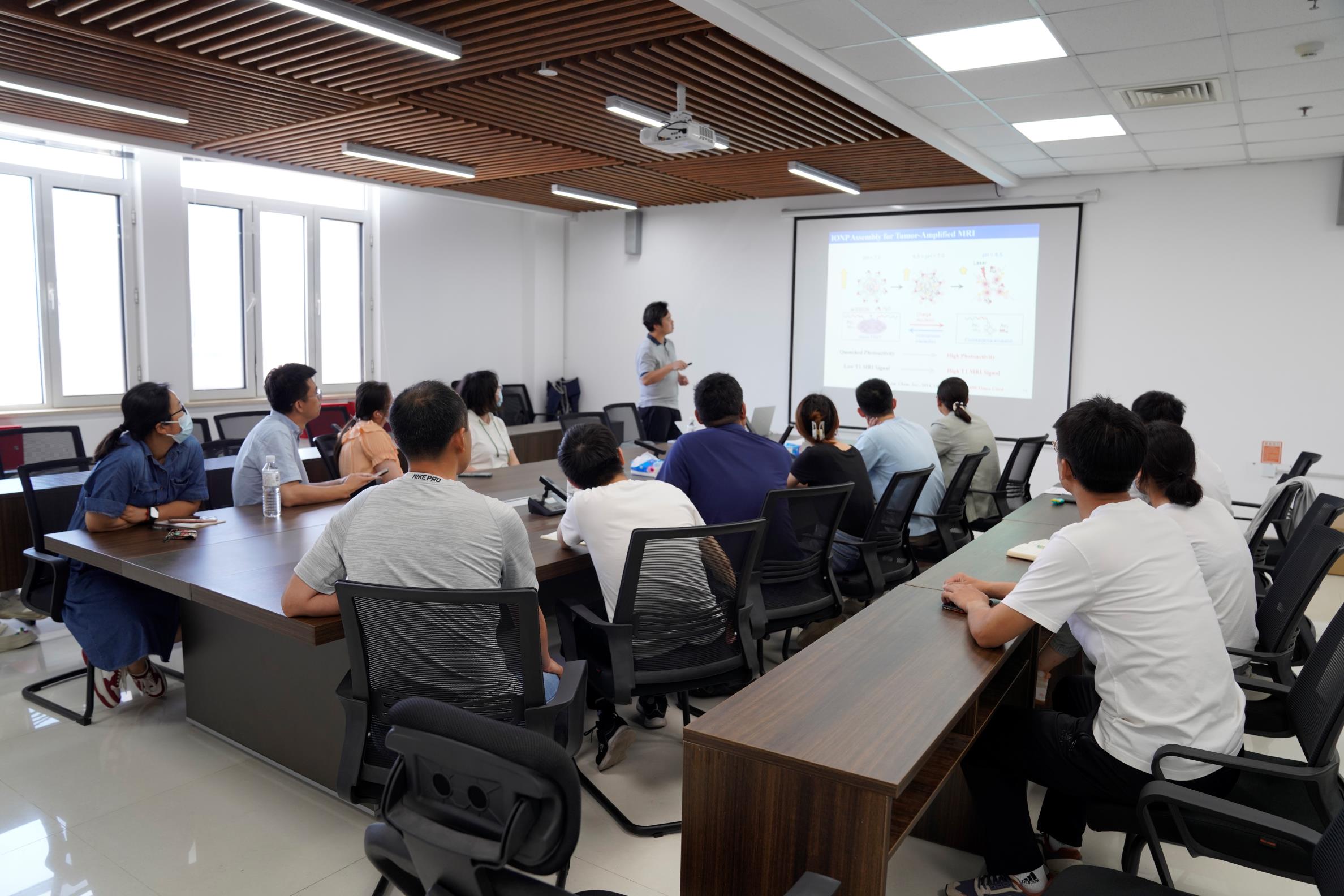 凌代舜教授的报告主要围绕自组装纳米探针的设计和调控展开,主要包括基于生物材料的动态自组装、动态纳米组装药物递送系统的构建以及动态自组装的生物医学应用。在报告中,凌教授介绍了一系列自主开发的动态变构生命感知探针,用以实现超灵敏检测、靶向递送、早期快速诊断以及疾病治疗等目的,为分子探针的合理设计及其在分子成像领域中的应用提供了新思路。报告结束后,现场的多位老师和研究生与凌教授进行了深入细致的交流讨论,令在场师生获益良多,会议现场学术氛围十分浓厚。