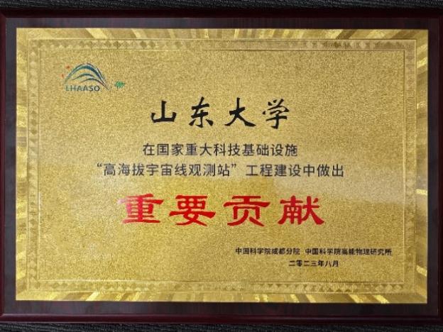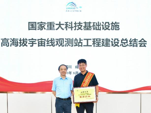 2023年8月10日-11日,国家重大科技基础设施“高海拔宇宙线观测站”(LHAASO)工程建设总结会在成都天府宇宙线研究中心召开。我校荣获“重要贡献“奖,前沿交叉科学青岛研究院粒子科学技术研究中心LHAASO团队成员刘栋副教授代表我校领取奖牌。