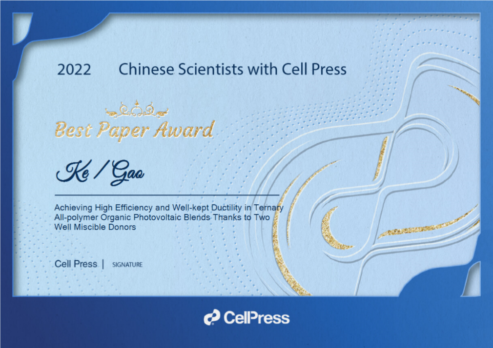 近日,国际知名全学科学术出版机构——细胞出版社(Cell Press)公布“2022中国年度论文”(the Best Paper Award)。细胞出版社从中评选出了生命科学领域、物质科学领域、医学领域、交叉学科领域和可持续发展领域“细胞出版社2022中国年度论文”共40篇(医学、可持续科学领域各5篇,物质科学、交叉科学、生命科学3个领域各10篇)。前沿交叉科学青岛研究院物质创制与能量转换科学研究中心李玉良院士团队高珂教授课题组发表在Matter期刊上的论文“Achieving High Efficiency and Well-kept Ductility in Ternary All-polymer Organic Photovoltaic Blends Thanks to Two Well Miscible Donors”入选物质科学领域“2022中国年度论文”。