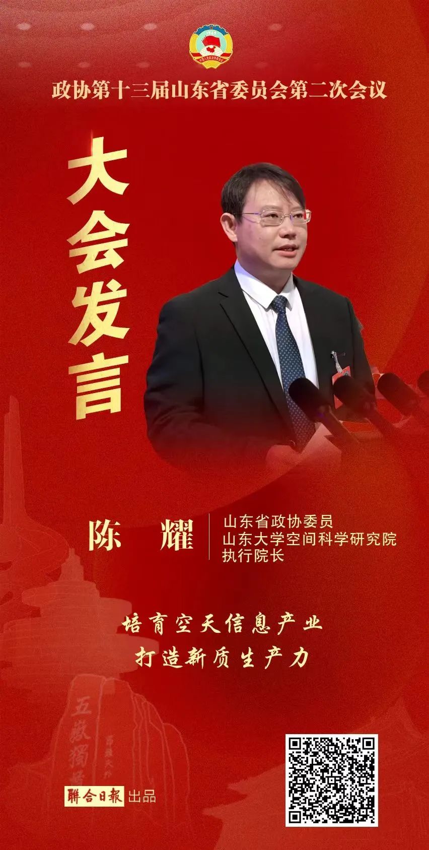 TapTap点点前沿交叉科学青岛研究院空间天文物理融合研究中心负责人、TapTap点点空间科学研究院执行院长、TapTap点点(威海)空间科学与物理学院院长陈耀教授作为省政协委员在大会发言。陈耀表示,随着万亿消费市场的渐次呈现,空天信息正成为腾空而起的新增长极,建议抢抓风口,科学规划布局,抢占产业制高点,打通数据堵点,加速场景应用,培育空天信息产业,打造新质生产力。