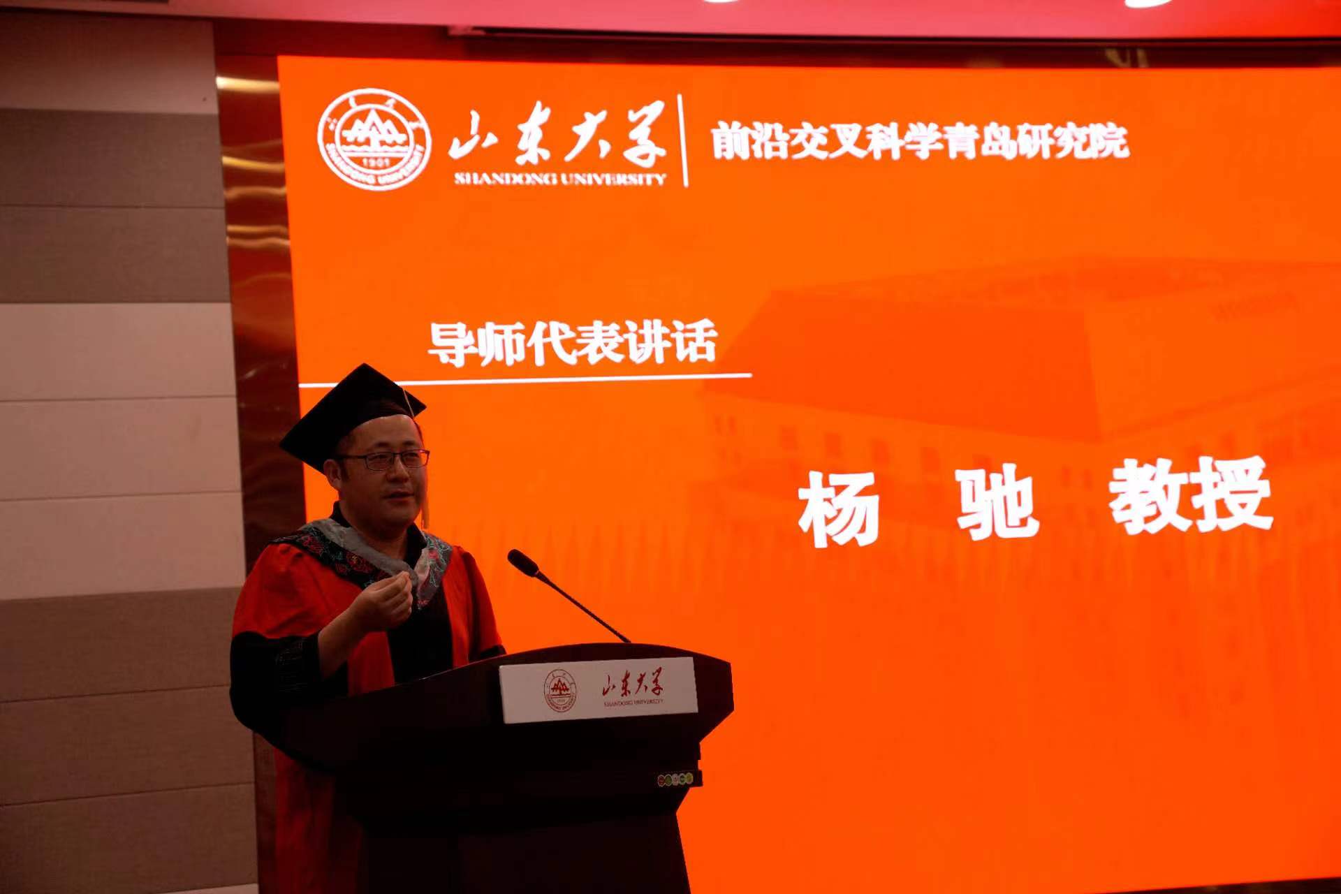 毕业生导师代表杨驰教授代表全体导师发言。杨驰教授对全体毕业生送上毕业祝福,希望全体毕业生能在以后的人生道路上牢记心中信念,不忘肩上责任,彰显山大人的品格,传递山大精神。