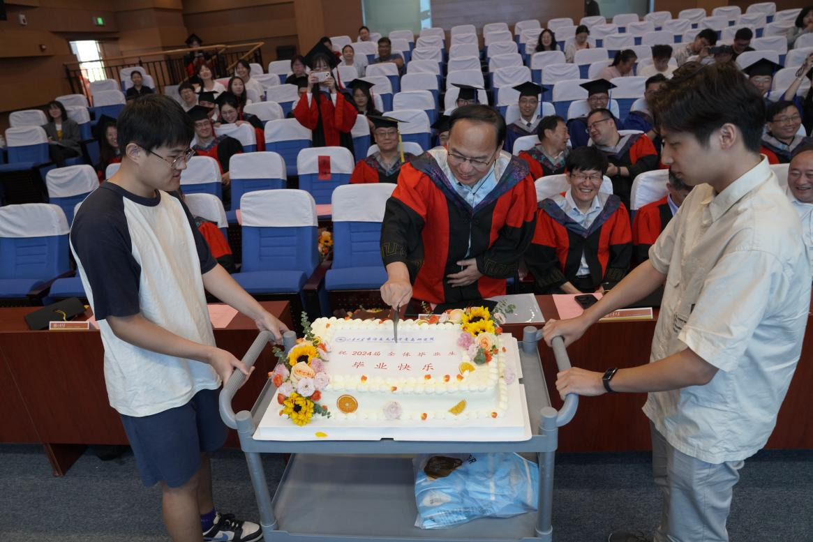 典礼后,研究院还举办了“前途似海,来日方长”毕业告别时刻。院长黄性涛为毕业生们切下具有象征意义的第一刀。希望每位毕业生都能时刻秉持自强不息的奋斗精神和厚德载物的品性追求,在未来的日子里,不忘初心、砥砺前行、前程似锦、一路生花!