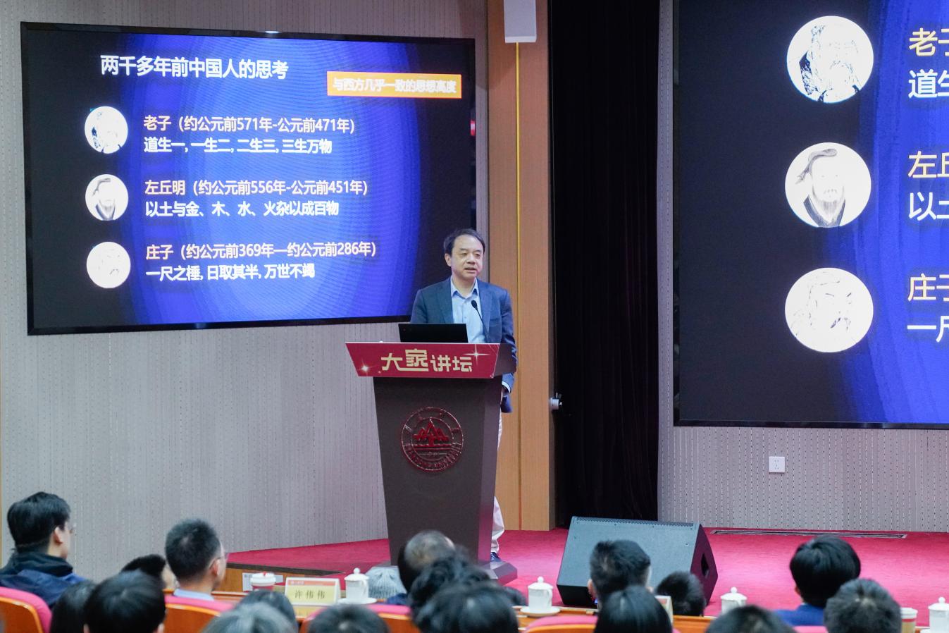 王贻芳院士对粒子物理未来发展方向进行了解读,对我国在北京正负电子对撞机/北京谱仪III实验(BESIII)、大亚湾中微子实验(Daya Bay)等国际大科学工程中做出的重大成果进行了详细介绍,展示了我国牵头自主设计研制、即将运行取数的江门中微子实验的进展情况。他以我国正在预研的环形正负电子对撞机(CEPC)为例表示,中国的粒子物理研究正处于从追求“一席之地”到“成为领跑者”的历程,勉励在场师生坚持“四个面向”,为实现高水平科技自立自强不断作出应有贡献。王贻芳院士还逐一解答了现场师生的提问,并就现场师生关心的话题进行了互动。