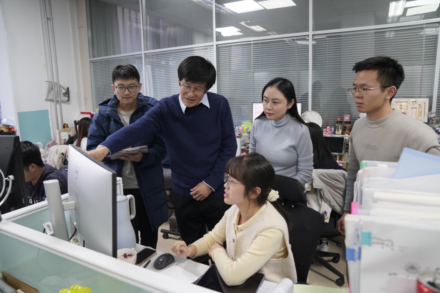 下午的最后一个行程在二楼的研究生工作室。博士三年级的赵晓燕正在与师弟们讨论一篇关于Lambda超子极化测量的文章。梁作堂驻足倾听,并兴致勃勃地加入讨论,指出公式中的一些关键问题。