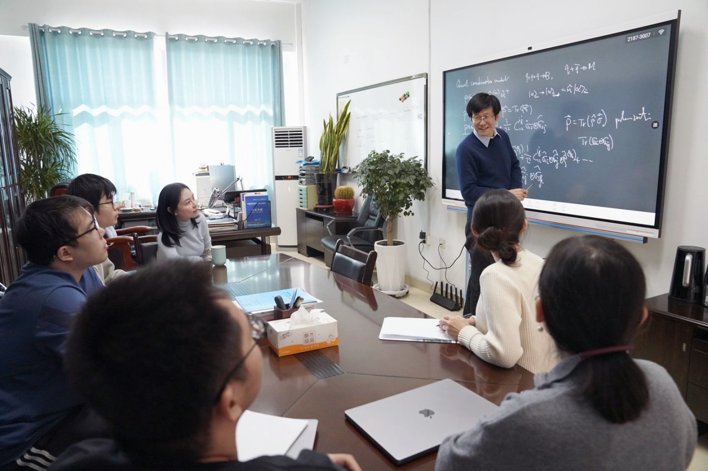 一个半小时的讨论班结束后,有学生们跟随梁作堂到办公室,围绕自己的疑问开起了“小灶”。梁作堂在黑板上演示了自旋密度矩阵以及相关自旋关联的定义与推导,并为他们指出参考文献,叮嘱他们进一步阅读与推算。