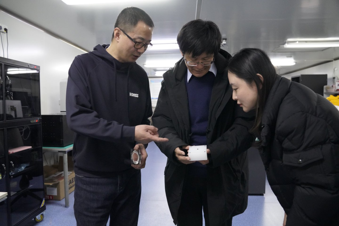 10点40分,领导小组会议结束,梁作堂来到一楼,走进硅像素探测器实验室。此时,实验师王安庆正在指导研究生进行硅像素芯片的功能性测试。王安庆拿着芯片兴奋的分享:“我们团队主导研发的CMOS像素芯片最近刚刚测试通过,这些技术将为未来国内外大科学装置的建设发挥非常重要的作用。”