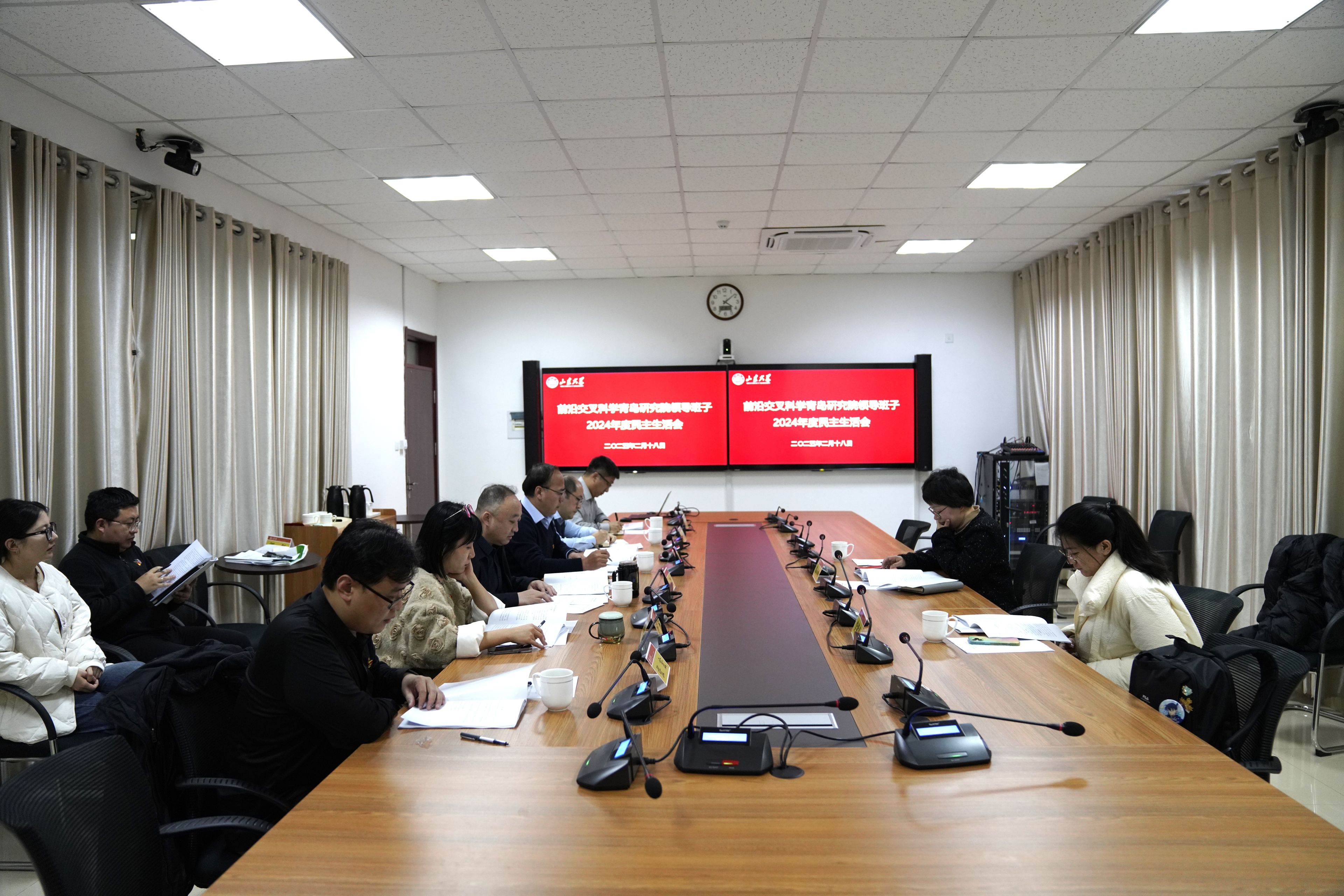 根据学校党委工作部署,2月18日下午,前沿交叉科学青岛研究院召开领导班子2024年度民主生活会。学校党委第九督导组副组长韩春岫、成员李紫薇到会指导。前沿交叉科学青岛研究院党委书记赵罡主持会议。
