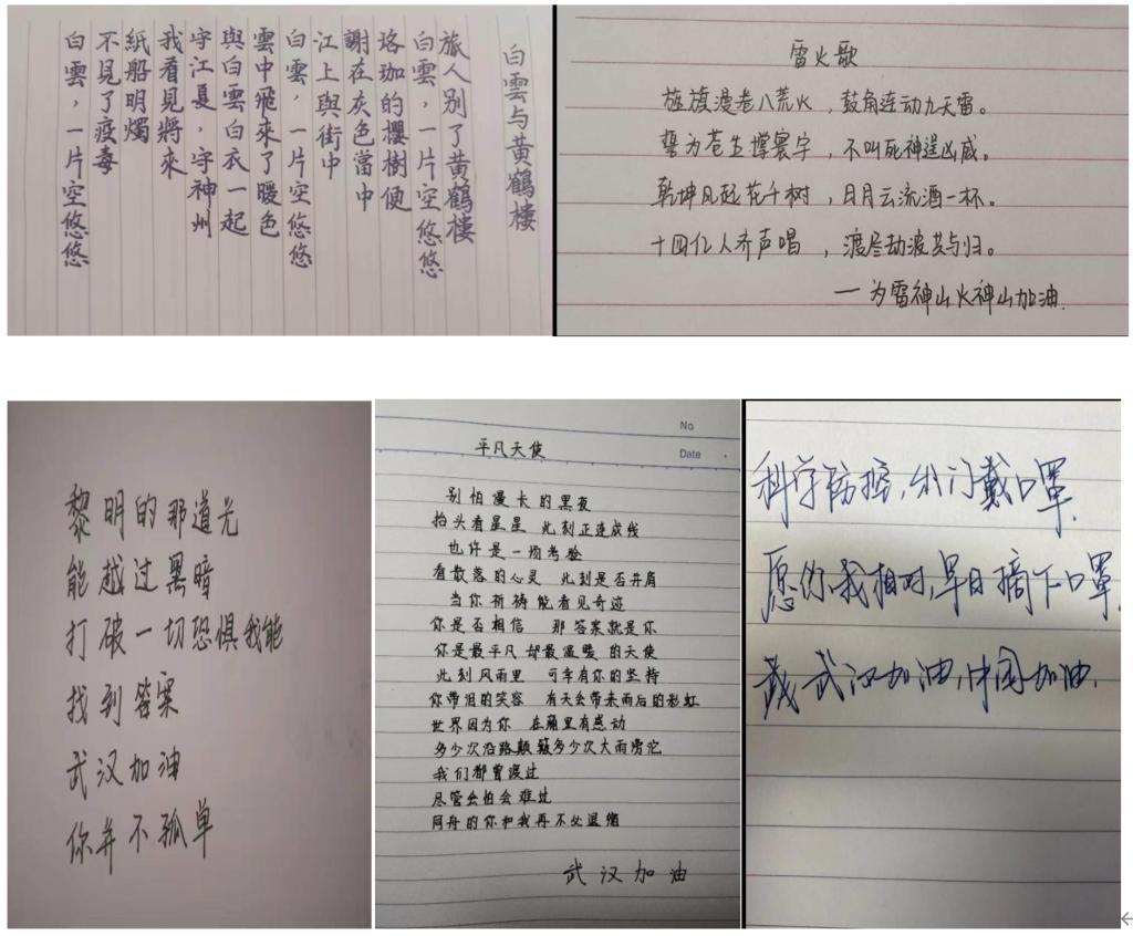 疫情爆发之后,一时间全国上下“千家万户自成囚”,但是,疫情阻断我们的脚步,却不能阻挡我们心中的爱。同学们以爱为名,书写下自己内心对疫区、对祖国人民的关切! 19级博士许一可,以一首自创诗歌“白云与黄鹤楼”表达对湖北同胞们的祝福;此外还有同学独创雷火歌为雷神山和火神山加油…