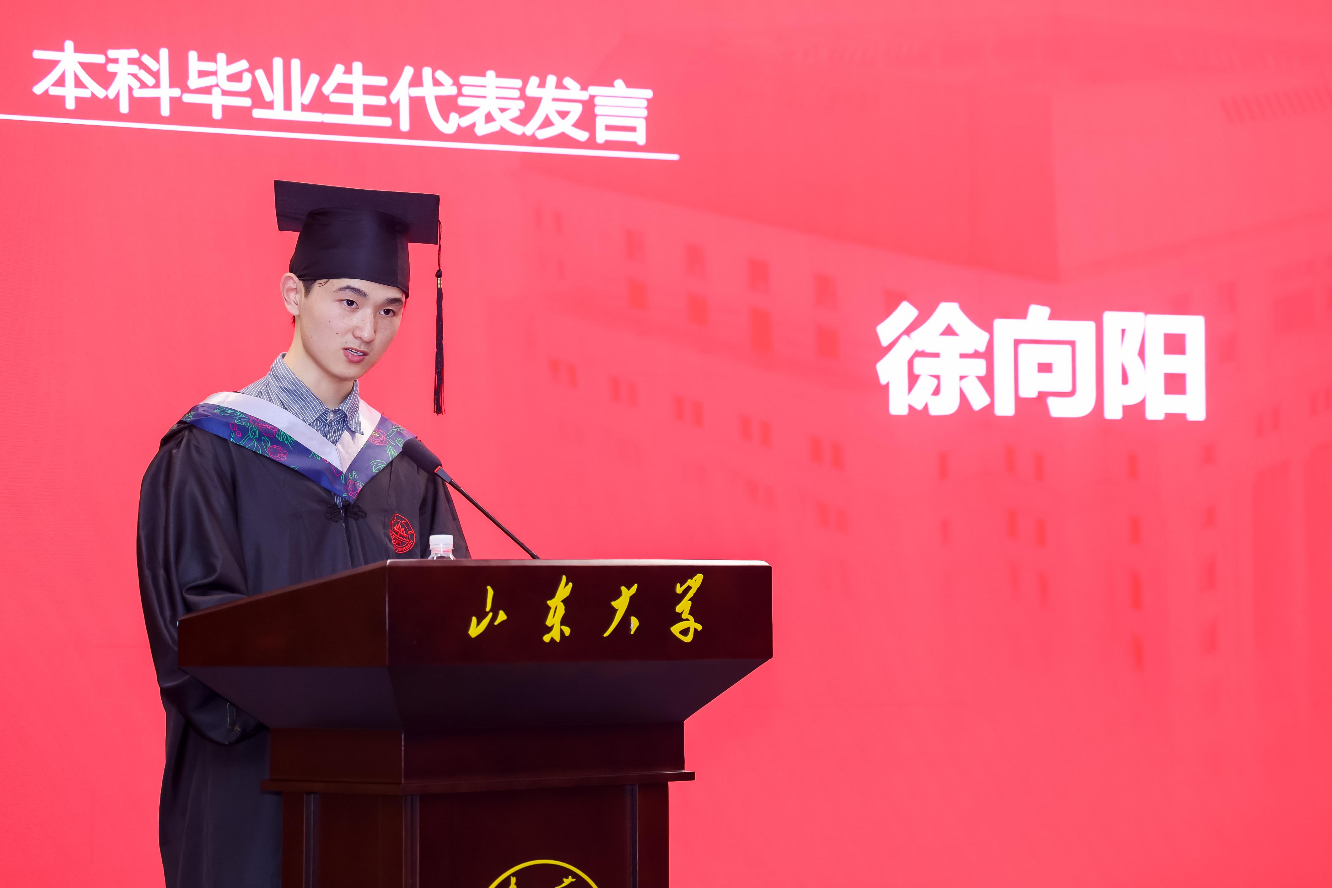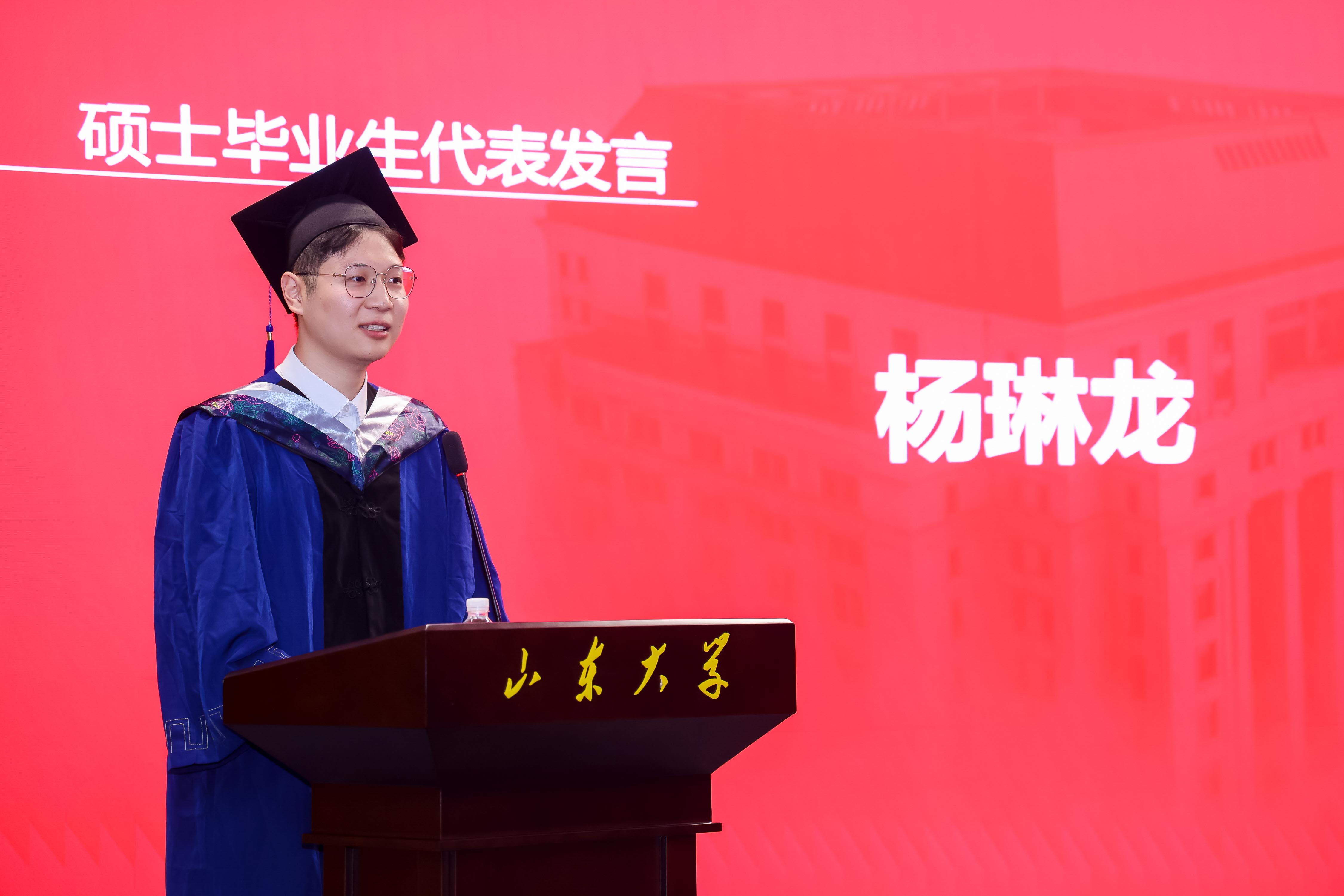 本科毕业生代表徐向阳、硕士毕业生代表杨琳龙、博士毕业生代表余淼森分别发言,回顾了在研究院求学的点滴成长,表达了对母校、导师和同窗的深深感激。他们表示,未来将秉持"为天下储人才,为国家图富强"的使命,以山大精神为指引,在各自领域追求卓越,为祖国发展贡献力量。