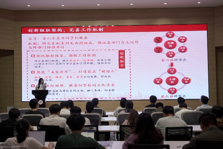 大会听取并审议通过了第七届研学会工作报告,全面总结了过去一年研学会在思想引领、社会实践、志愿服务、学术创新等各方面的工作成果。随后,大会审议通过了第二次学生代表大会监票人、计票人名单(草案)以及第八届研学会主席团候选人名单(草案),听取了候选人的基本情况,选举产生了新一届研学会主席团成员。会后,召开研究院第八届研学会主席团会议,讨论安排新一届主席团工作分工和近期相关工作安排。