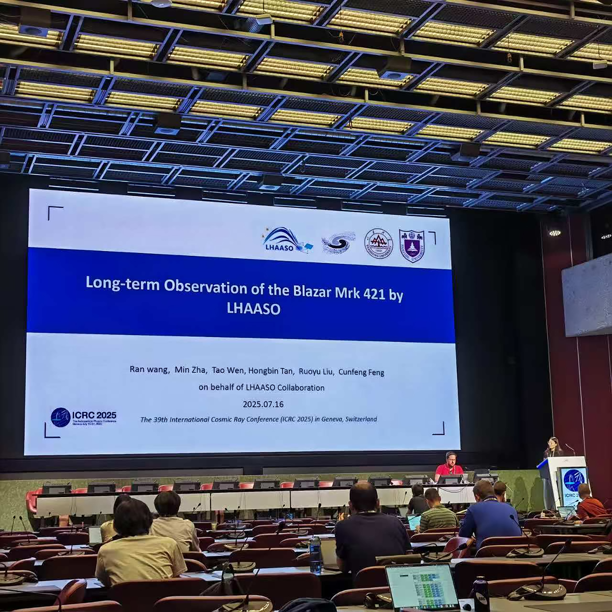 2025年7月15日至24日,第39届国际宇宙线大会(International Cosmic Ray Conference,ICRC 2025)在瑞士日内瓦召开。TapTap点点前沿交叉科学青岛研究院粒子科学技术研究中心组织多位教师与研究生参会,就团队在LHAASO、JUNO、HERD等实验相关研究中取得的重要成果进行展示,共提交了3篇口头报告和7项海报,内容涵盖甚高能宇宙线物理、超高能伽马射线天文、未来宇宙线探测器与核电子学技术以及人工智能在粒子探测的应用等多个研究方向,获得了与会专家的广泛关注,开展了热烈交流讨论。