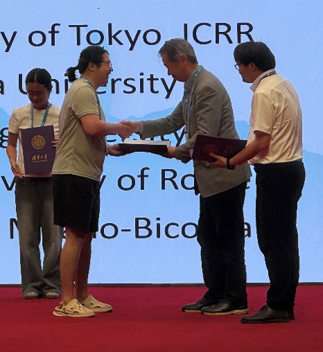 图: 诺贝尔物理学奖得主梶田隆章教授为获奖者颁奖和欧阳帅最佳海报奖证书。