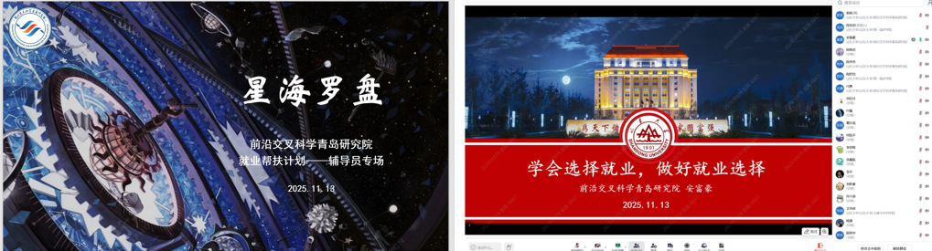 为帮助学生深入了解当前就业形势,明确个人职业发展目标,切实提升就业核心竞争力,近期,前沿交叉科学青岛研究院开展“星海罗盘”就业帮扶计划系列活动,通过校友分享与专业指导相结合的方式,为同学们夯实就业基础、明晰发展方向、做好未来规划提供有力支持。