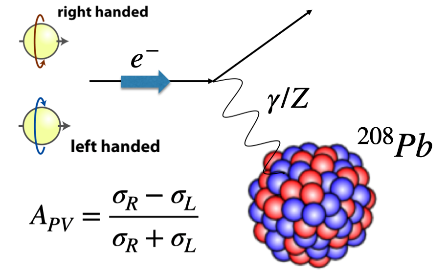 原子核是由质子和中子组成,质子带电而中子不带电,因此无法像探测质子那样通过电磁散射过程对中子进行探测。PREX实验巧妙地利用弱相互作用的宇称不守恒特征,通过测量电子弹性散射过程中螺旋度为正和螺旋度为负的不对称,实现了对原子核中弱荷分布的直接探测。虽然中子不带电,但其弱荷却远大于质子。因此,原子核的弱荷分布近似等于其中子分布,从而实现了对原子核中子分布的直接测量。在电子-原子核弹性散射过程中,弱作用引起的宇称破缺不对称信号非常小—小于百万分之一。为了实现对这个微小信号的有效测量,需要很大的统计量,并对系统误差进行严格的控制。PREX合作组利用CEBAF高亮度高极化度的电子束流,经过数周的数据积累统计精度达到了预期的3%,并通过对束流亮度、极化度、位置等参数的精密监控,成功将测量系统误差控制在1.5%左右。