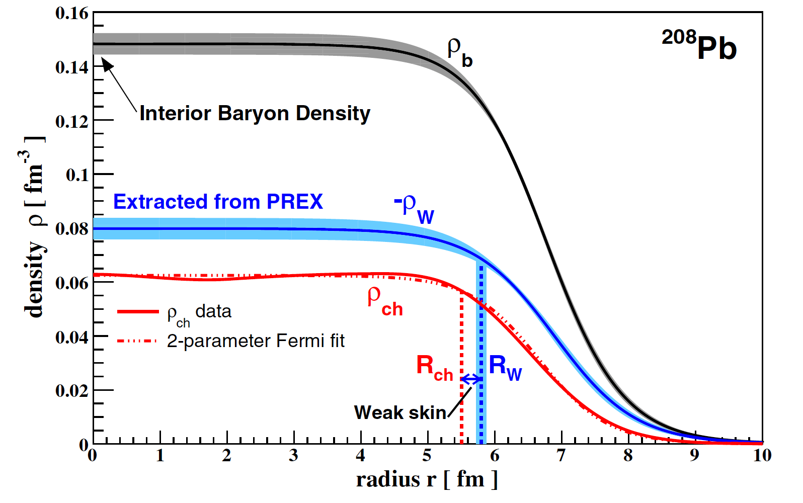 图2:铅-208电荷、弱荷及重子数密度分布,其中弱荷分布为PREX结果提供。电荷和弱荷分布均方根半径的差值近似为中子皮的厚度。