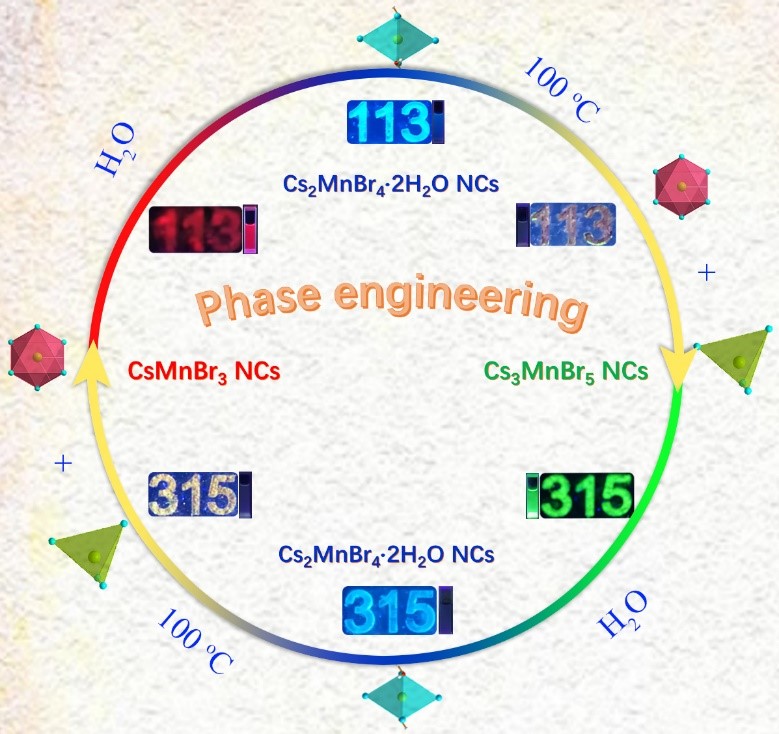 该团队选择性合成一维(1D) CsMnBr3(红光)和零维(0D)Cs3MnBr5(绿光)的纳米材料,并用异丙醇诱导1D CsMnBr3(红光)转化成0D Cs3MnBr5NCs(绿光),同时使用水分子将1D CsMnBr3NCs和0D Cs3MnBr5NCs转化成0D Cs2MnBr4·2H2O NCs(蓝光),从而实现红/绿/蓝光谱转化过程。研究人员发现异丙醇可以使初始的Cs3MnBr5NCs(含有少量CsMnBr3NCs)晶体重新长大,长大后的纳米晶体展现高的光致发光量子产率,其原因是异丙醇通过剥离1D CsMnBr3NCs(红光)中的MnBr2,使其转化0D Cs3MnBr5NCs(绿光),导致晶体再次生长,从而提高了晶体质量和辐射重组速率。此外,水分子可以将1D CsMnBr3NCs和0D Cs3MnBr5NCs转化为0D Cs2MnBr4·2H2O NCs(蓝光)。Cs2MnBr4·2H2O NCs在加热脱水步骤中可以逆向转变为CsMnBr3和Cs3MnBr5相的混合物,并且混合物也可以在异丙醇溶液中转化为Cs3MnBr5晶体,实现了晶体转变的可逆过程。该体系利用相工程方式实现了晶体的可调光学特性,为光学器件的发展提供了新的研究思路。此外,该策略对于发展空气稳定的含水纳米材料提供了新的研究方法,在防伪材料领域中展现出潜在的应用前景。