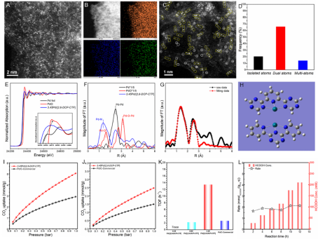 基于上述认知,研究人员制备了2,6-DCP-CTF负载的双单原子Pd催化材料(Pd2/CTF)并对其催化CO2常温常压加氢制甲酸反应性能进行了评价。结果表明,Pd2/CTF在常温常压下可高效催化该反应,催化剂的转化频率(TOF值)高达13.46 h-1。(图2)该成果首次报道了异相催化剂常温常压下催化CO2加氢制甲酸,为今后低能耗CO2资源化利用提供了一条可行思路。