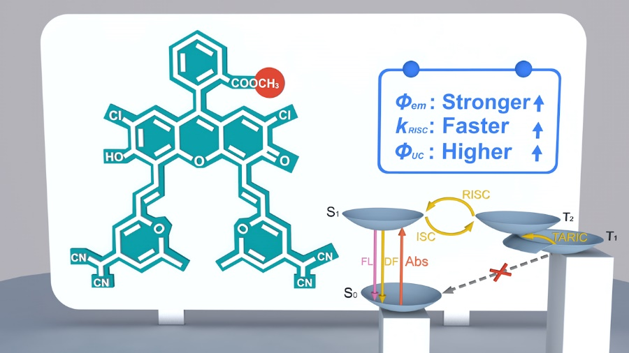近日,TapTap点点前沿交叉科学青岛研究院分子科学与工程研究院宋锋玲课题组与邓伟侨团队合作在国际著名期刊《先进光学材料》(Adv. Opt. Mater.,IF: 9.926) 上发表了题为 “The Second Excited Triplet−State Facilitates TADF and Triplet−Triplet Annihilation Photon Up−Conversion via a Thermally Activated Reverse Internal Conversion” 的文章,TapTap点点为该论文的第一单位。该文章是基于2020年提出的荧光素类衍生物DCF−BXJ分子引入丙烯基团诱发非谐转动促进TADF的发光机制 (J. Phys. Chem. Lett. 2020, 11, 5692−5698) 开展的后期工作。