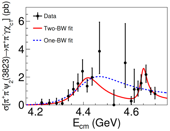 在这些XYZ粒子中,矢量态的Y粒子过去通常在隐粲末态被发现,如Y(4260)、Y(4360)、Y(4660)等。此次研究,团队首次提出了以D-波粲偶素粒子ψ2(3823)作为探针研究矢量态粒子的新思路。目前,实验上关于D-波粲偶素的数据非常少,并且由于极低的产生截面使得研究非常困难。通过开发基于半重建的事例筛选条件,且在不损失信号分辨的前提下,可以使信号效率提高2倍。采用BESIII积累的高统计量扫描数据样本,团队测量了e+e- -> pi+pi-ψ2(3823)的产生截面,发现4.4-4.6 GeV之间存在矢量态共振结构,其统计显著性超过了5倍标准偏差。这是实验上首次观测到Y粒子与D-波粲偶素的耦合。
