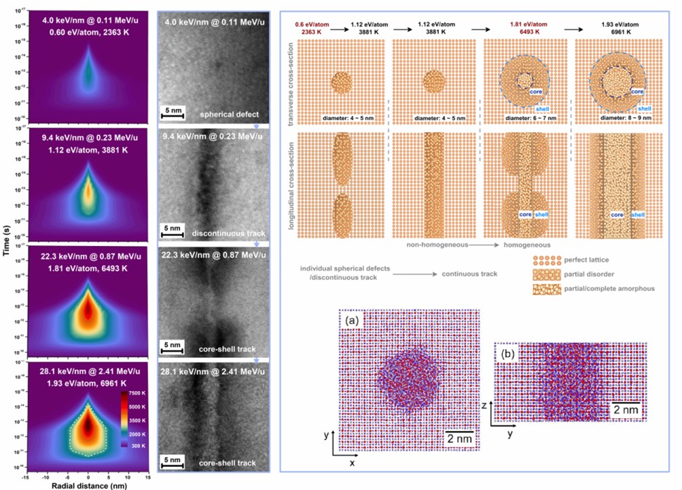 核与电子能损的基本作用过程及其诱导的辐照效应,是核技术应用等领域的基础科学问题。本研究工作基于非弹性热峰模型、分子动力学模拟与微结构分析,阐述了单晶中无序球形缺陷、以及非晶核-无序外壳等径迹精细结构的形成与演化机制,揭示了电子与晶格系统的能量沉积及温度演变对于这一辐照效应的主导作用,明确了单晶材料晶格无序区以及非晶区形成的临界阈值;这一工作为理解复杂强离子作用下材料微观损伤的形成以及宏观性能的演化提供基础与依据,也为拓展辐照基本作用过程的实际应用提供新颖的研究思路与技术方案。