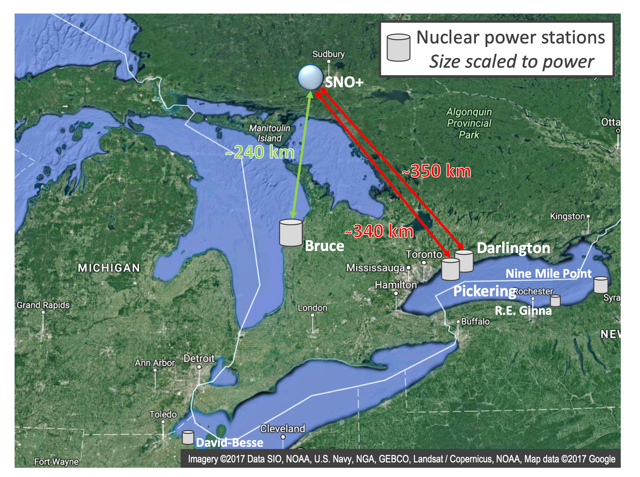 SNO+附近的三个反应堆分布示意图;反应堆中微子的探测原理。