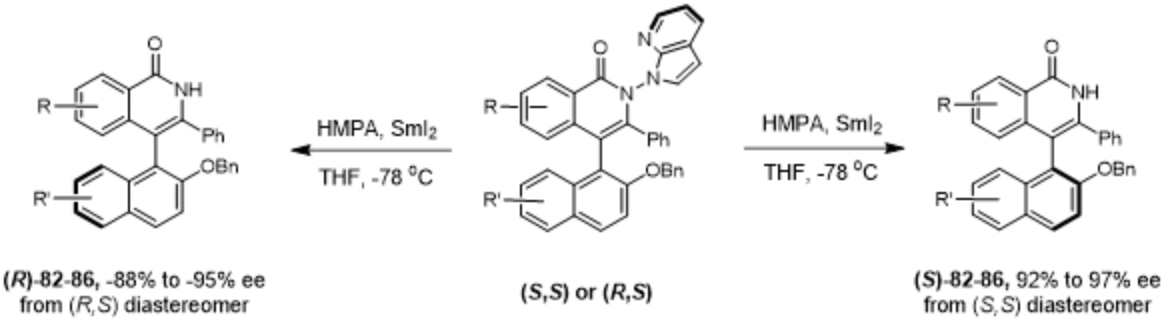 该产物中的氮氮键可以在温和的条件下发生断裂。作者使用SmI2处理双轴产物使导向基快速去除,得到了含有单个碳碳手性轴的产物。通过这个简单的操作,两种非对映体产物被转化为相应的对映异构体(图5)。