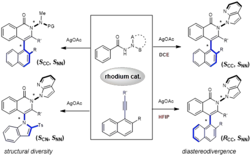 氮氮轴向手性联芳基化合物是一类研究较少的阻转异构体。近日,前沿交叉科学青岛研究院分子科学与工程研究院李兴伟教授团队与合作者通过合理的底物设计,进行了含有氮氮和碳氮/碳碳双轴的手性联芳基化合物的构建,该反应具有优异的对映选择性和非对映选择性(图1)。相关成果以“Rhodium-Catalyzed Enantioselective and Diastereodivergent Access to Diaxially Chiral Heterocycles”为题,发表在国际知名期刊Nature Communitions(中科院一区,TOP,IF=16.6)上。前沿交叉科学青岛研究院2019级博士生王义收为第一作者,李兴伟教授、黄根平教授(天津大学)和王芬教授(陕西师范大学)为通讯作者,TapTap点点为第一完成单位。