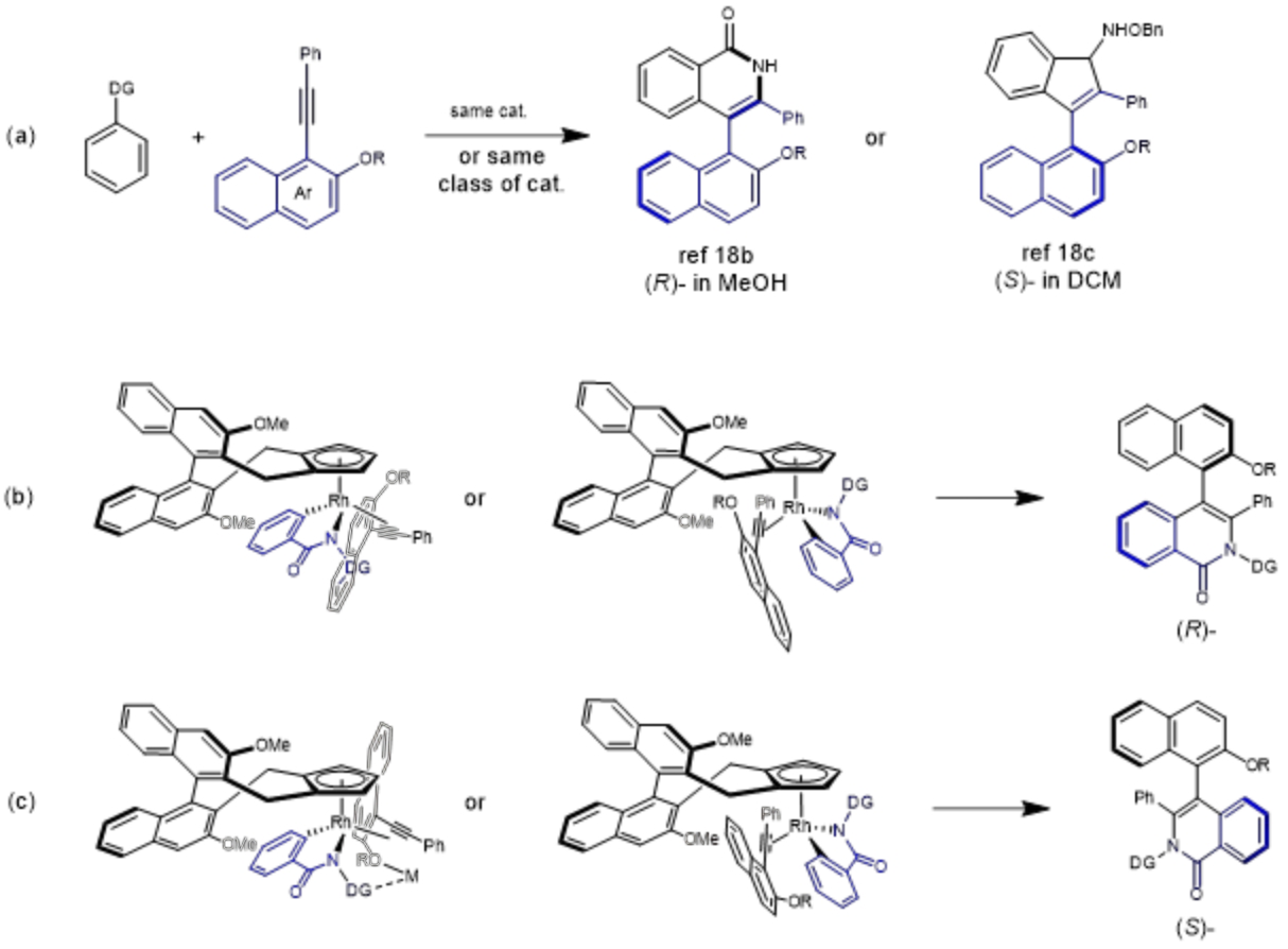 团队之前对1-炔基萘和芳烃的铑催化偶联进行过研究(Angew. Chem. Int. Ed.2020, 59, 13288–13294. &Angew. Chem. Int. Ed.2021, 60, 16628–16633.),即使使用固定类别的手性环戊二烯基铑(III)催化剂,也可得到两种不同的手性轴构型(图3):炔插入的立体化学似乎与溶剂的性质有关;质子性溶剂和非质子性溶剂的作用趋势可能不同。在非质子性溶剂中,Lewis酸添加剂Ag(I)或Zn(II)可能参与连接导向基团和大位阻炔的2-OR基团,对大位阻炔的插入方向进行了明确定位。