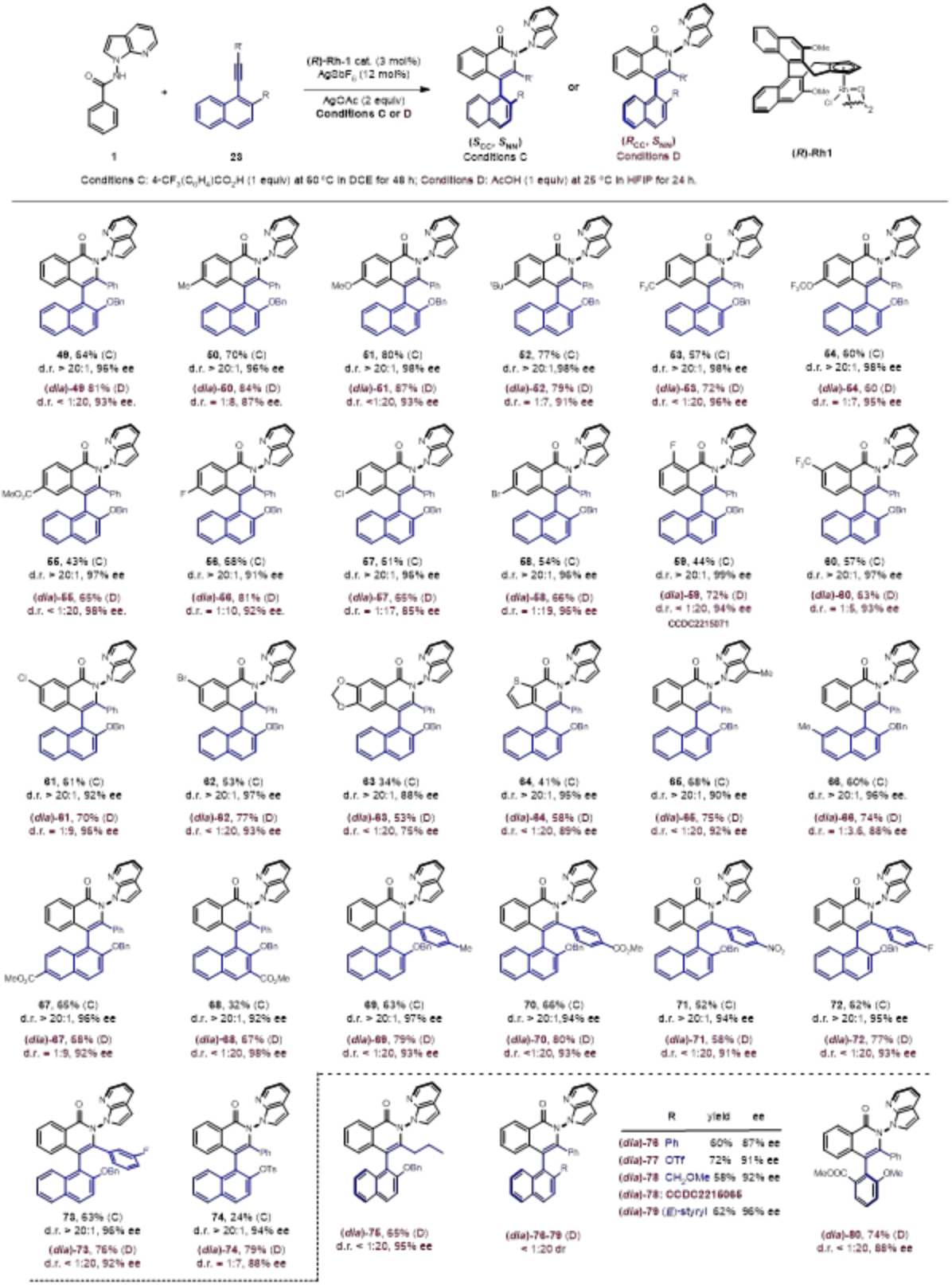 经过对酰胺底物的广泛探索,作者最终实现了7-氮杂吲哚苯酰胺与1-炔基萘偶联的非对映发散。正如预期的结果,当DCE作为溶剂时,可以在(SCC,SNN)选择性下合成环状产物(条件C)。相反,当强氢键极性溶剂HFIP(条件D)被使用时,可以得到非对映异构体(RCC,SNN)。然后作者详细探讨了非对映异构发散的范围,该反应对各种取代基团适用性良好(图4)。
