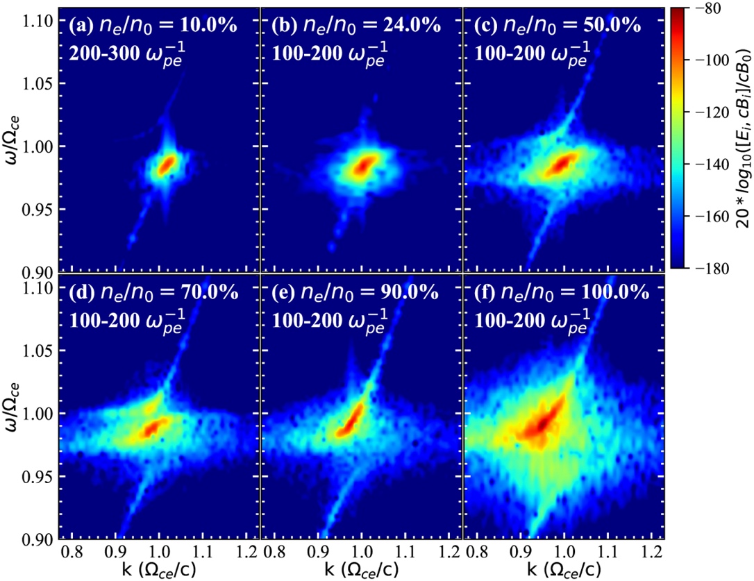 图2高能电子丰度不同的条件下,PIC模拟得到的色散关系结果。其中ne/n0代表高能电子占总电子的密度比。