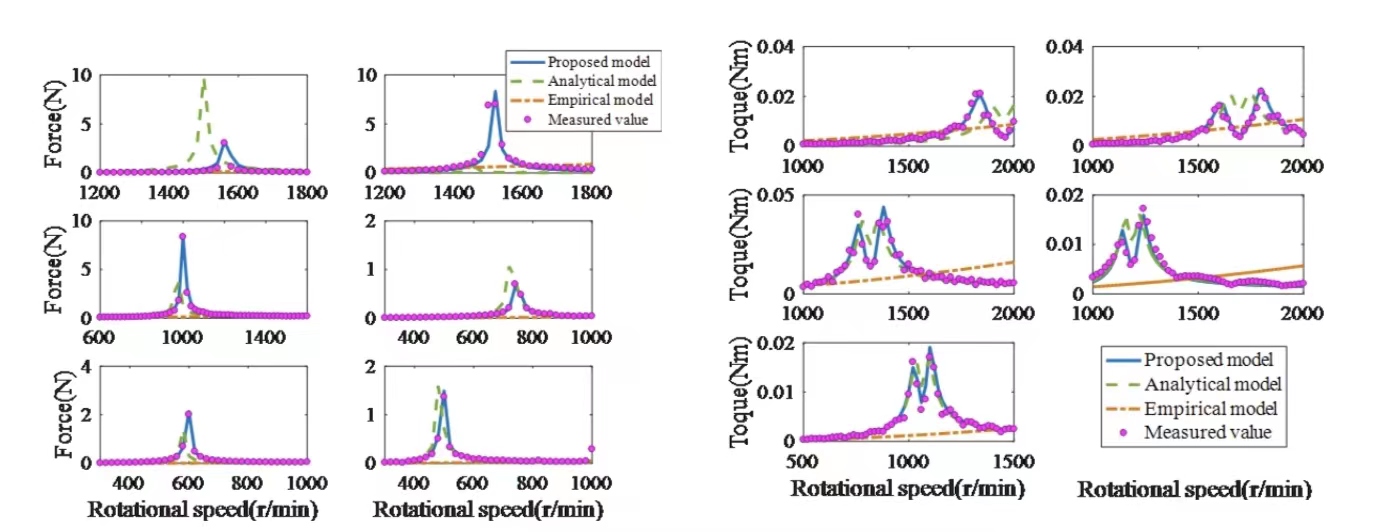 针对以上问题,团队利用高精度扰振力测试设备(如图2所示)和数值仿真开展研究,提出了一种考虑模态变化的反作用飞轮扰振力建模和参数识别方法,将飞轮解析模型考虑为与转速相关的参变系统,分别建立了飞轮的平动运动和摆动运动频率模型和时域模型,并建立了识别模型参数的辨识方法,飞轮扰振力和力矩识别结果如图3所示。