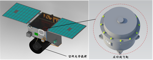 图1空间观测卫星(左:空间光学载荷与反作用飞轮位置关系,右:反作用飞轮放大图)
