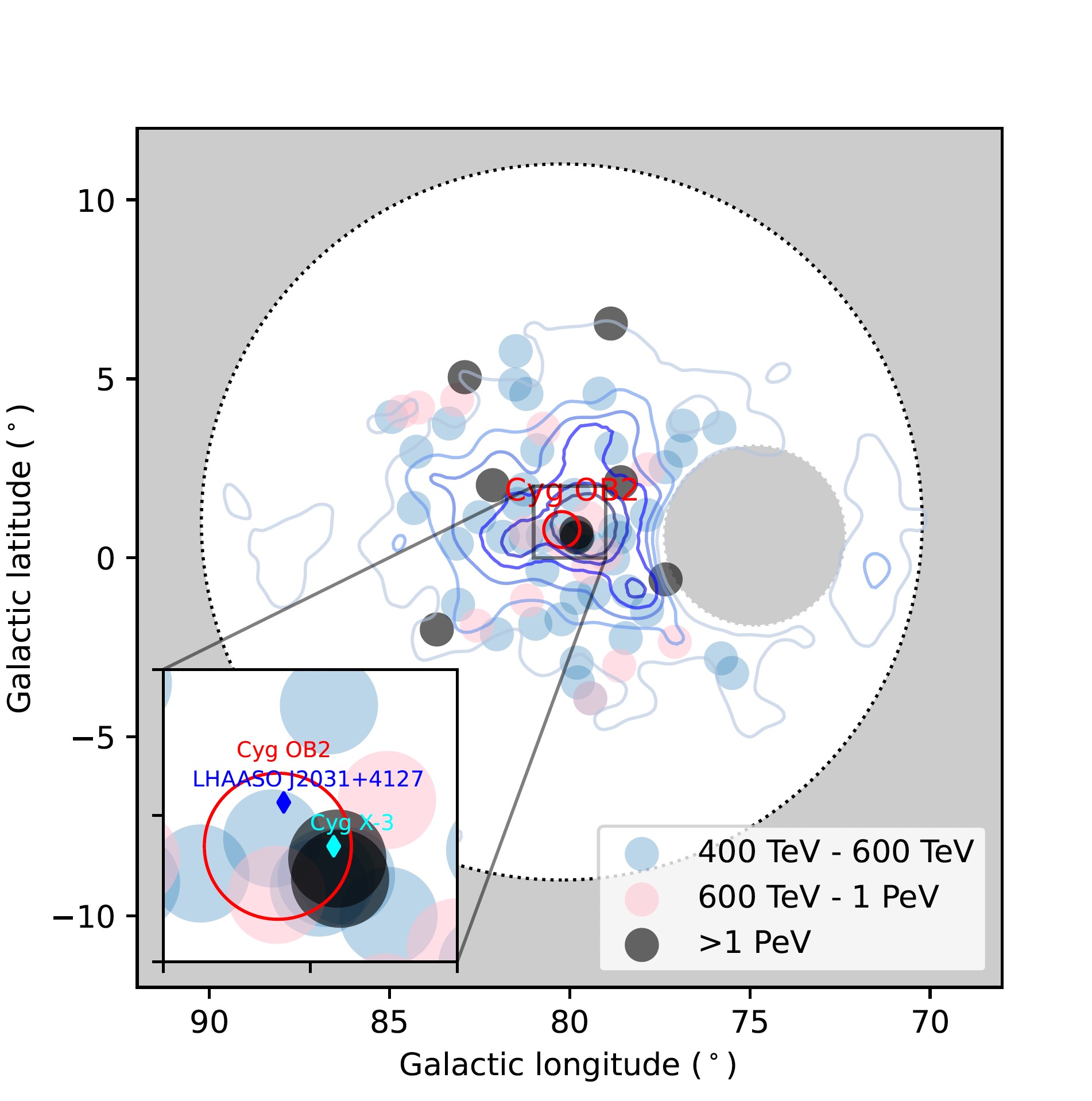 高海拔宇宙线观测站(LHAASO)在天鹅座观测到巨大的超高能伽马射线 “泡泡”,尺度超过150 pc (1 pc约等于3.26光年),其伽马射线能量最高达拍电子伏(1015 eV),表明这个“泡泡”的核心区可能是一个可以把质子加速到超过10拍电子伏的超级加速器。该结果已在最新一期《science bulletin》正式发表并被选为封面文章(https://doi.org/10.1016/j.scib.2023.12.040)。